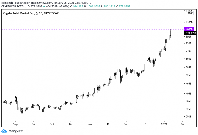 The total value of all cryptocurrencies passed $1 trillion Wednesday for the first time ever, per CoinGecko‘s index of 6,124 assets. At its prior peak in late 2017, the market’s total capitalization was just above $760 billion, according to TradingView.