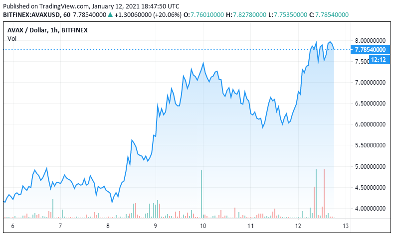 WikiBit 2021-01-13 14:51One such coin is Avalanche (AVAX). The cryptocurrency has gained 130 percent in the past seven days per CryptoSlate data and is one of the top-performing crypto assets of the past 24 hours.