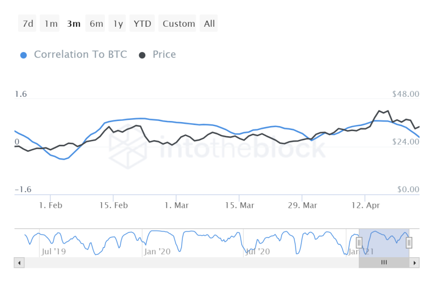 WikiBit 2021-04-25 16:58In the coming month, if LINK were to continue on its recovery run, the decreasing correlation with BTC may, in turn, become an added layer of immunity against such corrections and an immense sign of relief for LINKs short-term traders.