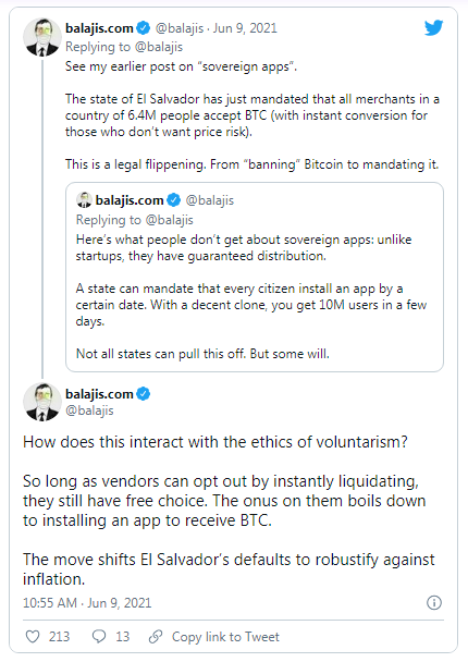 According to him, if El Salvador would declare that their legal tender is BTC only, then it would set an argument that BTC elsewhere is not subject to capital gains tax also.
