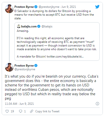 “By adopting BTC as legal tender, a ‘currency’ that is decentralized, they avoid hyperinflation and it gives them an amazing opportunity to prosper as a country and a government,” he said.