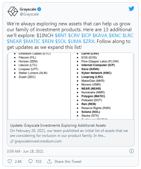 The new additions bring the total number of assets being explored by Grayscale to 31. Grayscale currently offers products tracking the performance of 13 different assets.