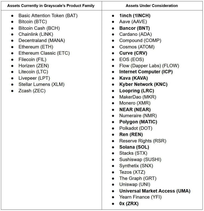 According to Grayscale “We will continue to update this list as we review additional assets. As the digital asset ecosystem expands, we invite our investors, partners, and the community to follow us for periodic updates about assets were exploring.”
