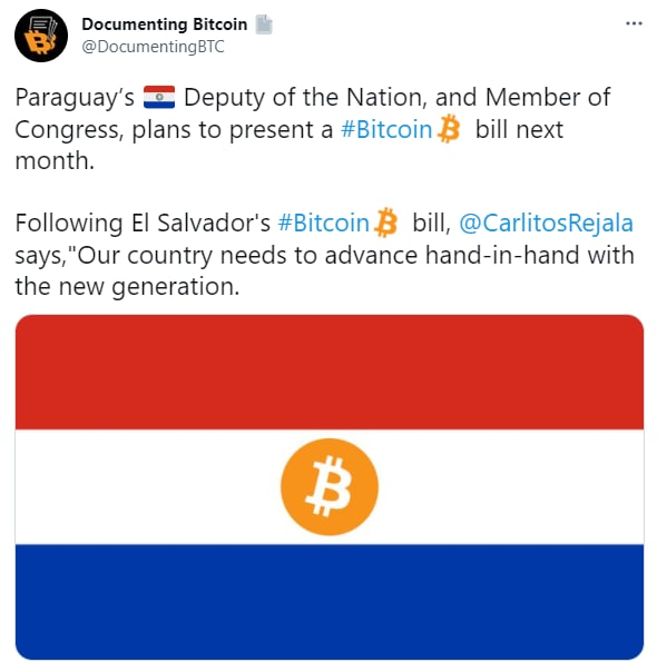 “The bill, if passed will position Paraguay as the second country to embrace Bitcoin as legal tender after El Salvador.”