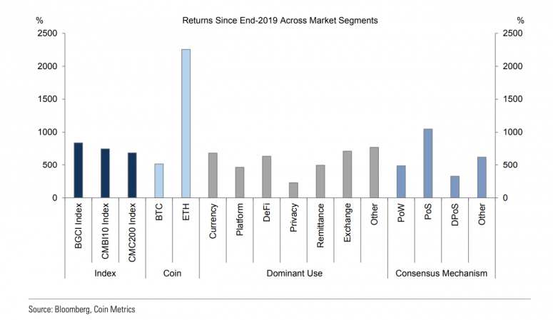 Meanwhile, tokens associated with proof-of-stake networks have outperformed proof-of-work tokens since the end of 2019, according to the report.