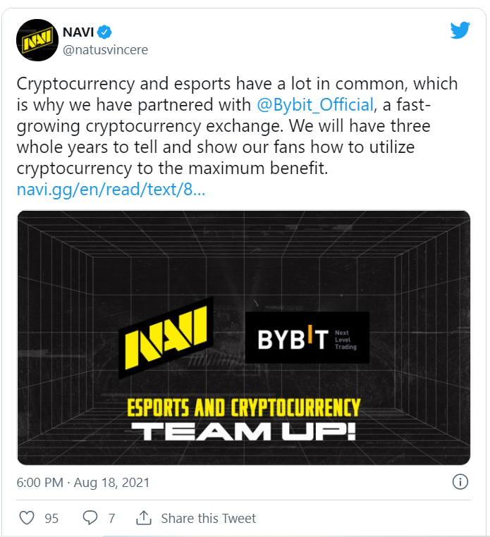 Crypto exchange Bybit has entered a multi-year partnership with esports team NAVI, with the exchange saying that this "marks the beginning of its foray into esports collaborations."