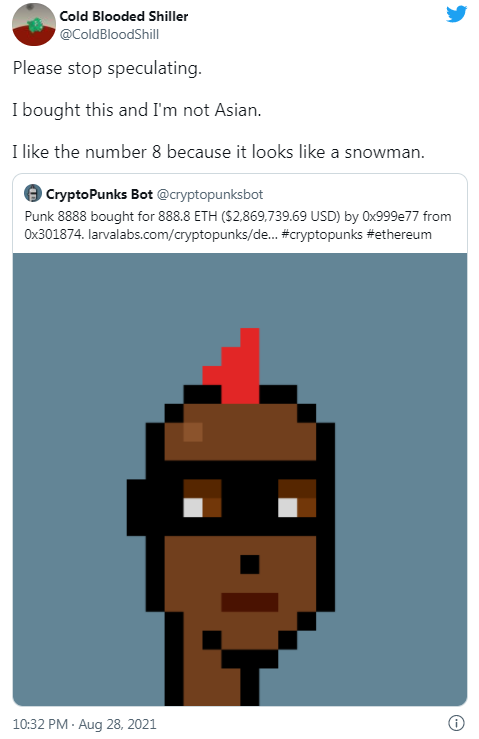 And while the trading hours of the buyer of CryptoPunk #8888 are synced with China, a pseudonymous investor who claims to have bought it said theyre not Asian, and only like the number 8 “because it looks like a snowman.”