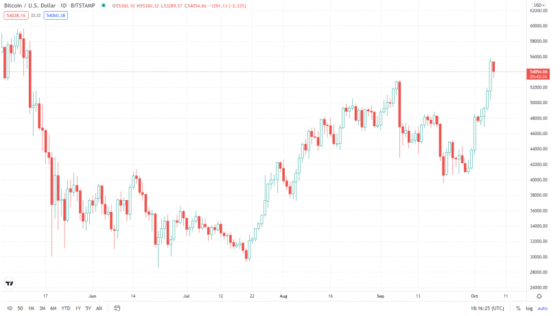 Bitcoin is currently trading just above $54,000 after a slight pullback from recent highs.