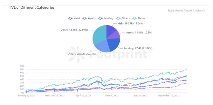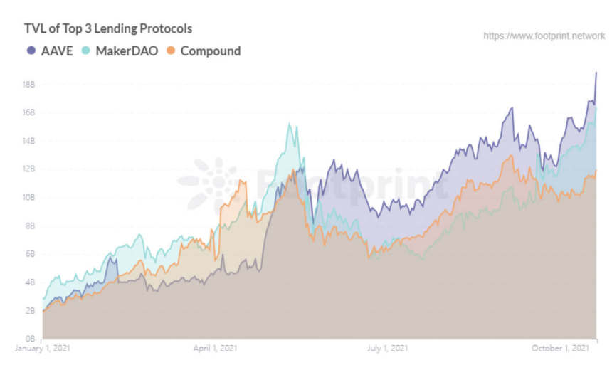 According to Footprint, the number of platforms in the DeFi lending category grew by 263% to 69 since December 2020, setting a record TVL of $48.44 billion, accounting for 21.04% of all DeFi platforms and networks entire TVL.