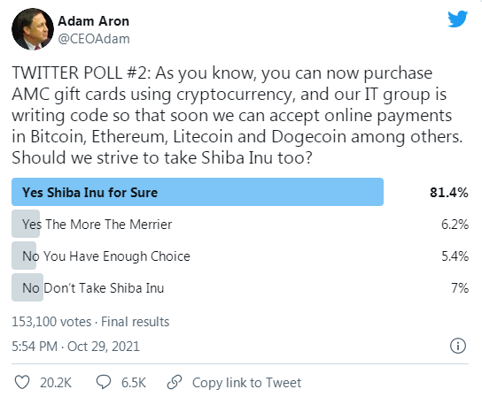 As reported by U.Today, Aron published another Twitter poll to find out whether it was prudent for the movie chain to add another hit meme coin. With 153,100 users taking part in the voting process, a whopping 81.4% of participants supported such an initiative.