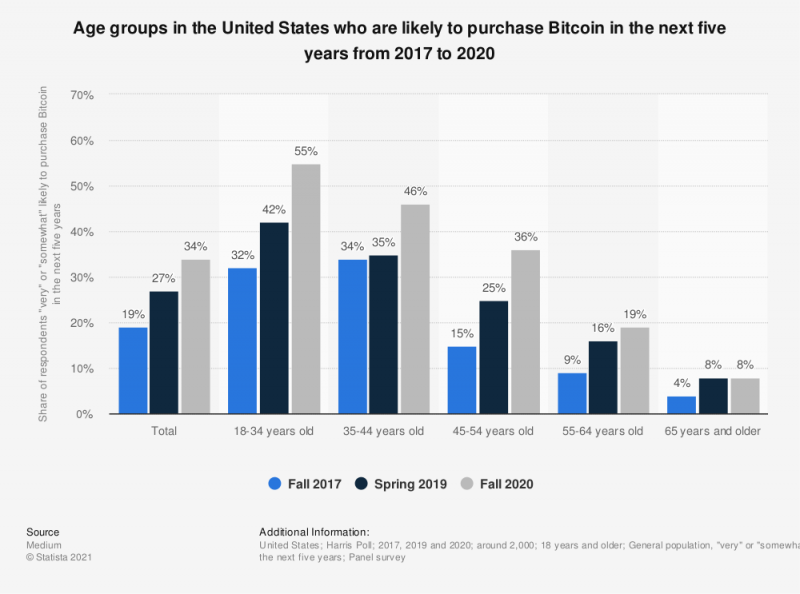 The percentage of people indicating they are either “very” or “somewhat” likely to buy Bitcoin in the next 5 years increased by 13 percentage points among 18-to 34-year-olds between the spring of 2019 and the fall of 2020.