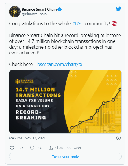 Binance Smart Chain daily transaction is more than that of BTC and ETH combinedThe Binance-backed platform saw transactions that were well above 14.7 million on November 16, surpassing the previous record of 13.1 million it had set on July 29.