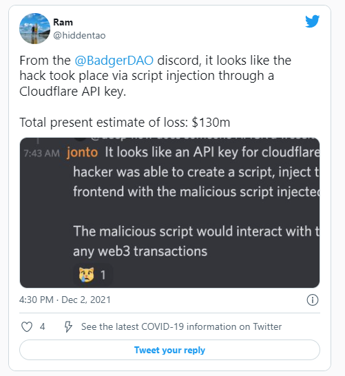 Front-end hackJudging by the early user reports, the attack started on late Wednesday/early Thursday, and according to current speculation on the protocol‘s official Discord channel, an API key for Cloudflare was compromised, which allowed the attacker to tamper with Badger’s front-end interface.