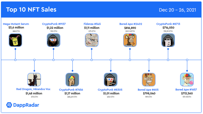 DappRadar‘s top 10 NFT sales list singled out Gerring’s Mega Mutant Serum purchase as the most expensive in the past week.