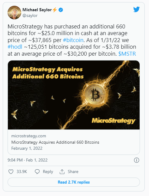 MicroStrategys doubles down on Bitcoin following conference announcementAccording to the latest Form 8-K document filed with the SEC, MicroStrategy purchased 660 BTC between December 30th, 2021, and January 31st, 2022. The company paid $25 million for its latest purchase, at an average price of approximately $37,865 per Bitcoin.