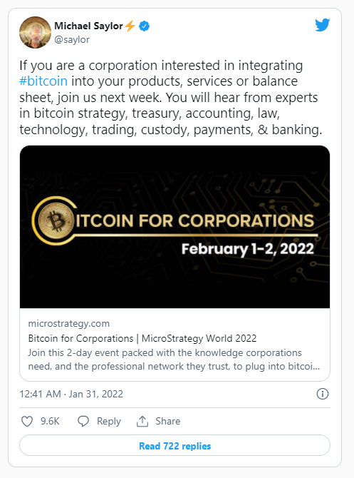 The event, set to take place on February 1st and 2nd, will also explore the benefits of having Bitcoin on corporate balance sheets, its CEO Michael Saylor said on Sunday.