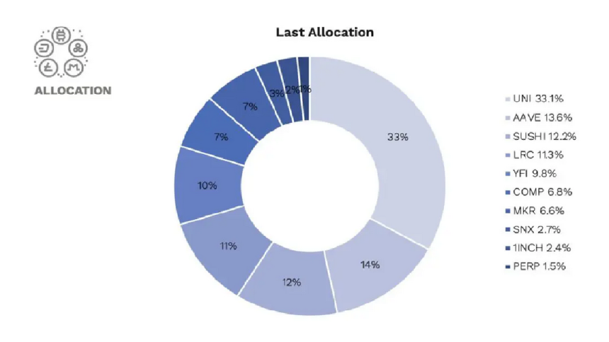 The max weighting for any given token is capped at 35% and the group of assets is selected each month. The firm has listed more than 20 approved tokens that can be used as the components for the Index each month such as UniSwap (UNI) Compound (COMP) Aave (AAVE) and SushiSwap (SUSHI).