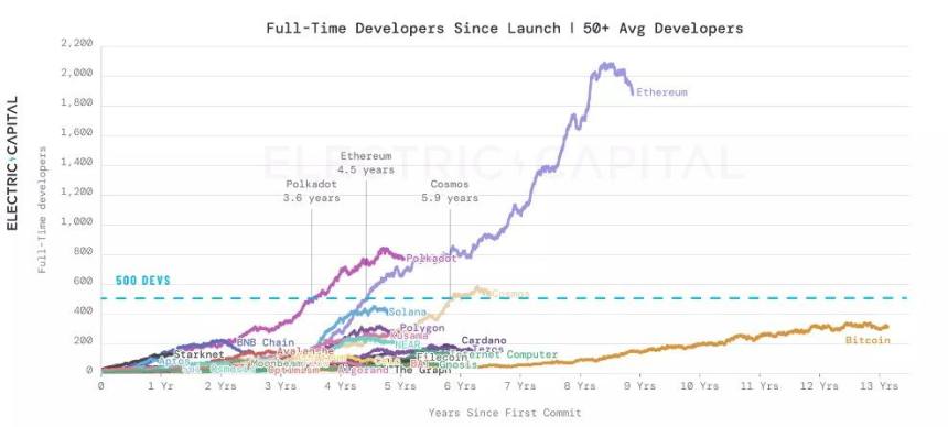Ethereum continues to dominate developer activity, having increased its full-time developer count by 9% to 1,873 — which is more than the next three highest ecosystems combined: Polkadot (752), Cosmos (511) and Solana (383).