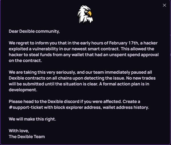 As of 6:35 pm UTC on Feb. 17, the Dexible front end shows a popup warning about the hack whenever users navigate to it.