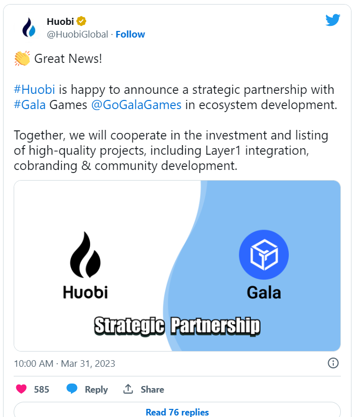 Huobi Global also took to Twitter to underscore the importance of its partnership with Gala Games as part of its commitment to the development of the Web3 ecosystem. The community has expressed support for the partnership, citing the advantages of the Layer-1 blockchain.
