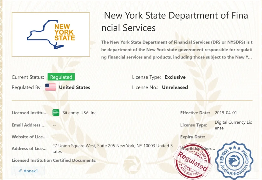 Finally, Bitstamp USA, Inc. is regulated by the New York State Department of Financial Services (NYSDFS) and holds a Digital Currency License. The Regulation Number for Bitstamp USA, Inc. with NYSDFS is unreleased.