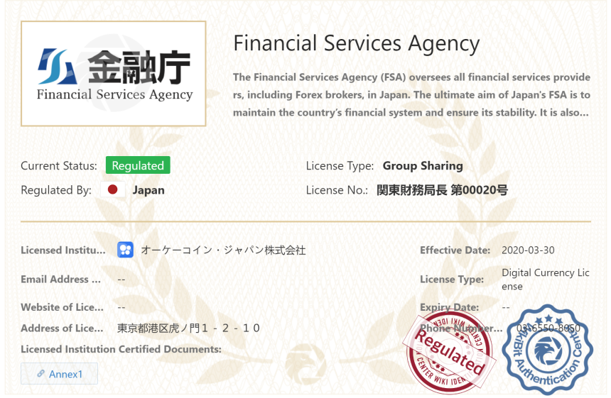 OKCOIN is subject to regulation by several regulatory agencies. In Japan, it is regulated by the Financial Services Agency (FSA) with the regulation number of “関東財務局長 第00020号”. The company, known as “オーケーコイン・ジャパン株式会社,” holds a Digital Currency License.