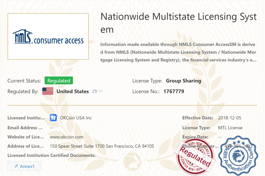 In the United States, OKCOIN is regulated by the Nationwide Multistate Licensing System (NMLS) with the license number 1767779. The company, called OKCoin USA Inc, has obtained an MTL License.