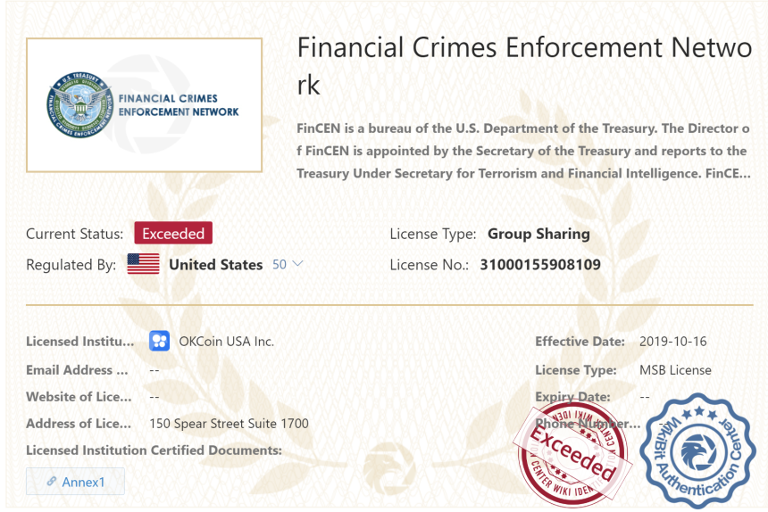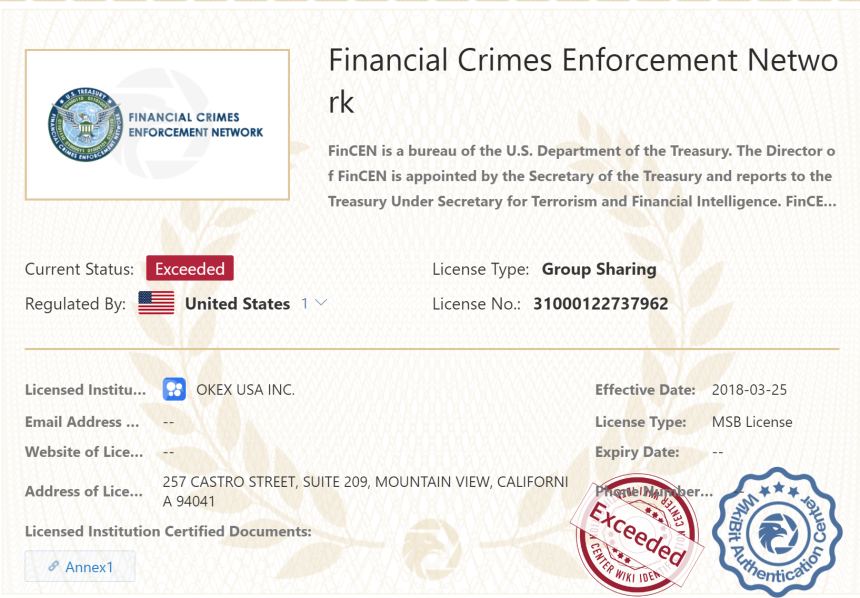 The company is also regulated by the Financial Crimes Enforcement Network (FinCEN) in the United States, with two separate license numbers (31000122737962 and 31000155908109) and the license type being MSB License. The respective company names are OKCOIN USA INC. and OKEX USA INC.