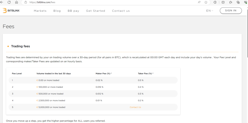 The fourth Fee Level is attainable with a trading volume of €2,500,000 or more in the last 30 days. In this tier, the maker fee is just 0.01%, and the taker fee is reduced to 0.2%. However, if you are a high-volume trader dealing with €5,000,000 or more in the last 30 days, the specific maker and taker fees are not provided, and you are instructed to contact BITBLINX directly for fee details.