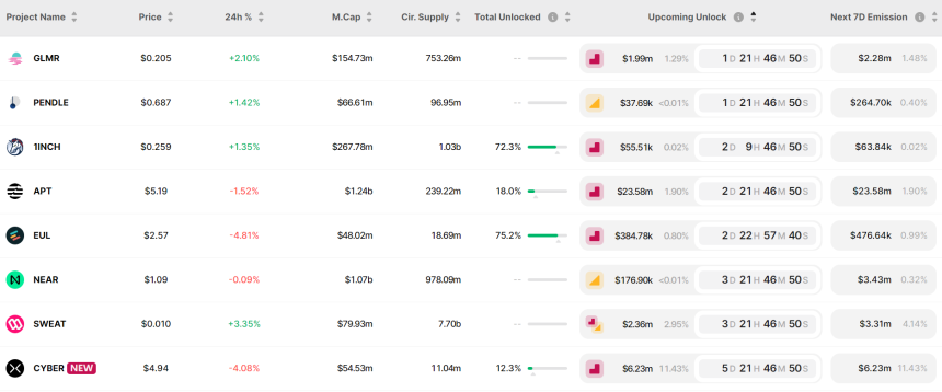 Token Unlock data shows that this week, several tokens including GLMR, 1INCH, APT, EUL, SWEAT, and CYBER will experience one-time substantial unlocks. Here are the details:
