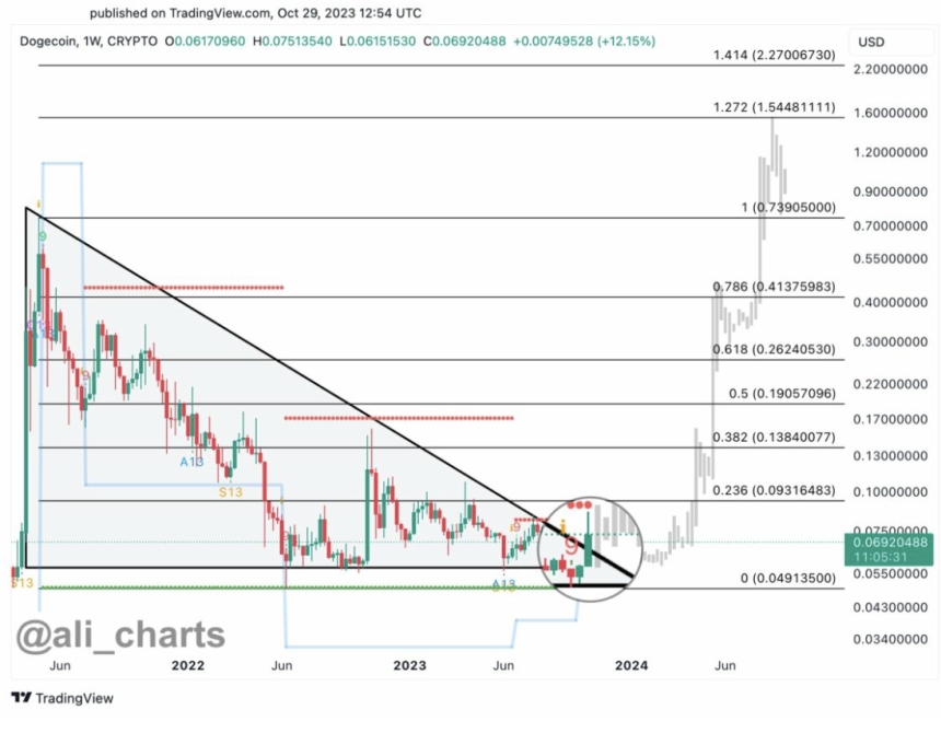 above the $1.6 target, before a final drawdown back below $1.“#Dogecoin shows promising signs, breaking out from a multi-year descending triangle on the $DOGE weekly chart! The confirmation of a buy signal from the TD Sequential indicator within this timeframe reinforces #DOGE bullish outlook,” Martinez said in the post.