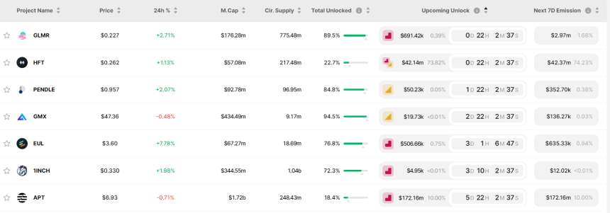 Token Unlocks data shows that this week (November 6th to November 12th), several tokens including GLMR, HFT, EUL, and APT will experience significant unlocks: