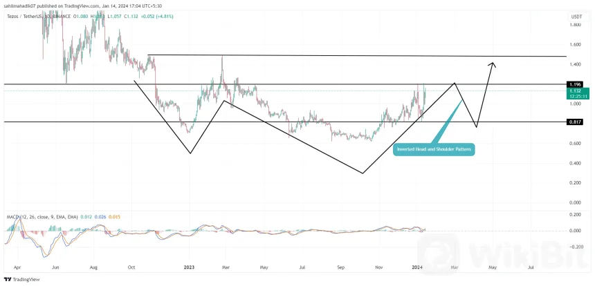 Amidst the heightened anticipation for a spot Bitcoin ETF, the Tezos (XTZ) price witnessed a significant rebound from the $0.8 local support earlier this week. This bullish momentum led to an impressive 42.7% increase, positioning buyers to potentially retest the last swing high of $1.19.