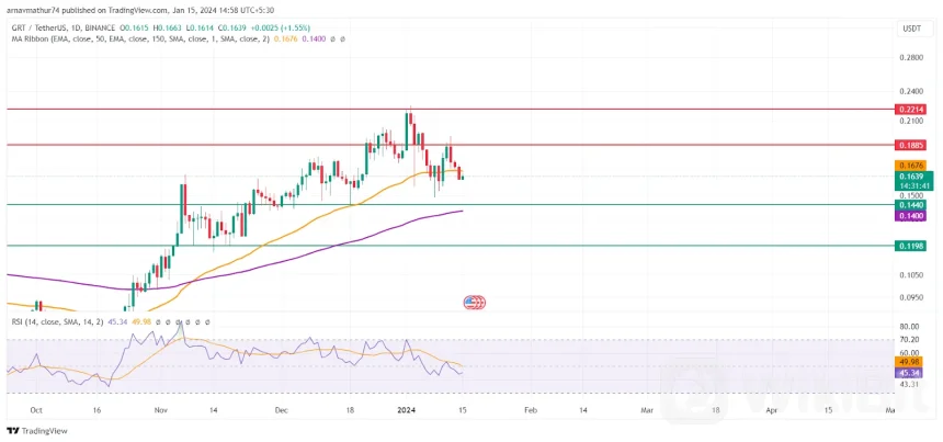At press time, the GRT price is on the 50-day EMA the bullish investors are struggling to protect against a downfall. The support level is at $0.1440 and $0.1198 while the GRT bears are likely sitting on the $0.1885 resistance level. The 150 day EMA is just below the current support level and is likely to provide support in case of a downfall