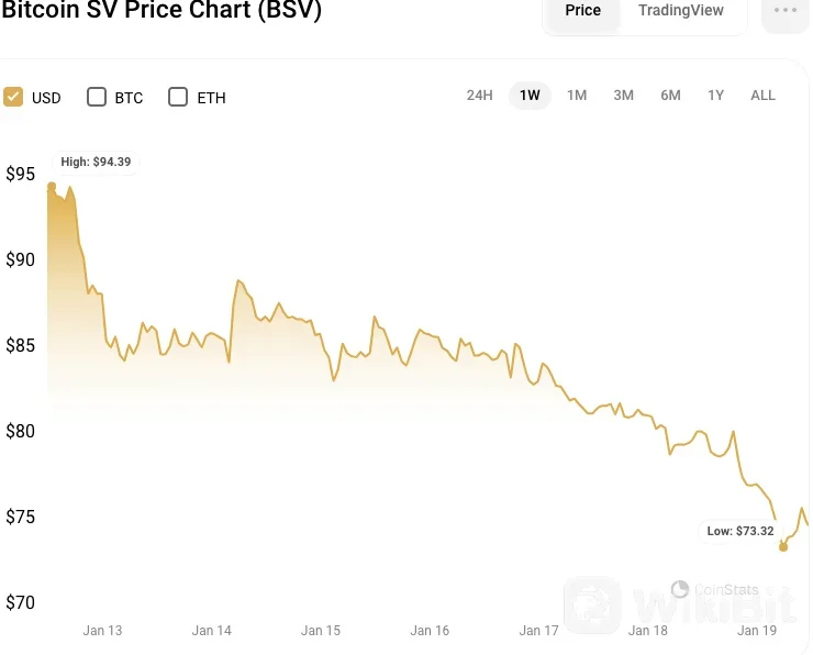 Bitcoin SV (BSV) has concurrently tumbled by 6% in the last 24 hours, marking a 23% decrease over the past week. This decline brought the live price of Bitcoin SV down to $74.69, with a trading volume surpassing $91 million. The cryptocurrency, once a market leader, has now fallen to the 47th position in market cap rankings, with its total market value hovering around $1.67 billion.