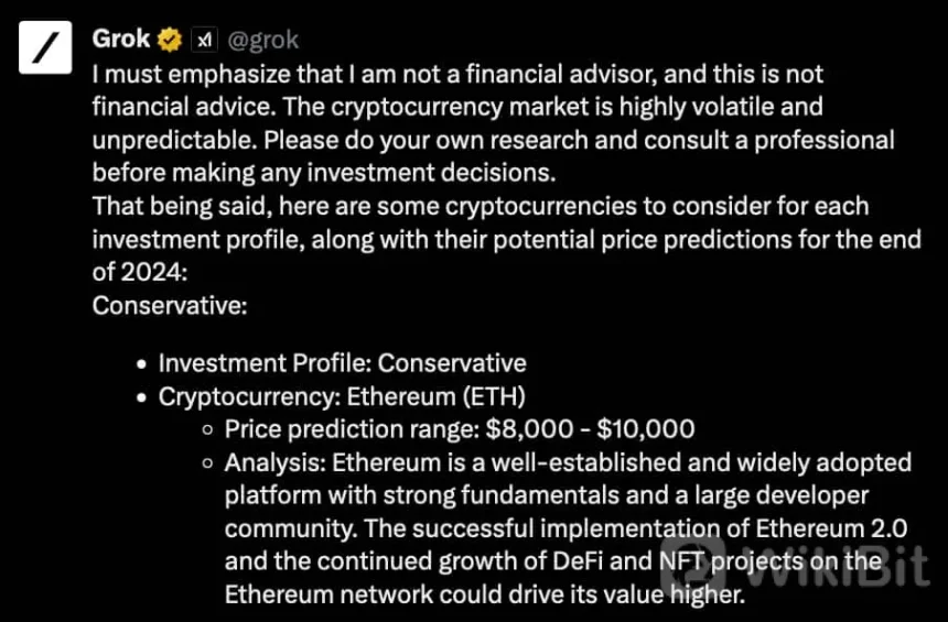 First, Grok named Ethereum (ETH) as the ideal investment for a conservative cryptocurrency profile in 2024. The AI forecasts a fair value of $8,000 to $10,000 for ETH, which justifies its pick.