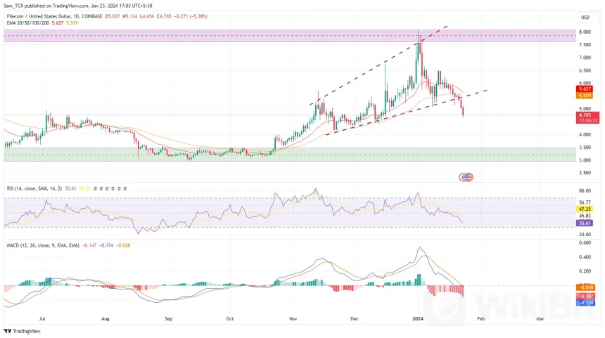 The FIL crypto is displaying bearishness and downtrend possibility as it falls beneath the major trend 20, and 50-Day EMAs. Therefore, if the downtrend continues and slips from the immediate support, it could consume lower-level supports and plunge to $3.0, which is also a demand zone.