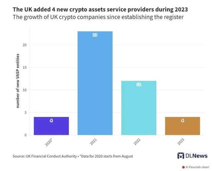 Zooming into the details shows that 23 crypto entities were registered in 2021. The subsequent introduction of stringent advertising rules saw the figure drop exponentially in 2023, however.