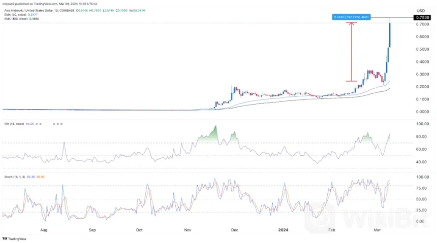 The daily chart shows that the AIOZ token price has gone parabolic in the past few days. It has moved above 192% above the 50-day moving average. Further, the coin has gotten highly overbought, with the Relative Strength Index (RSI) sitting at 84 and the Stochastic Oscillator moving to almost 100.