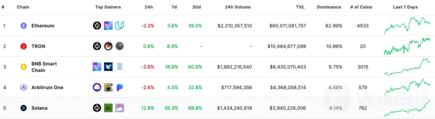 In the 7-day and 30-day timeframes, Solana has seen a TVL growth of 35.3% and 89.8%, respectively. As displayed in the chart below, it surpassed the performance of the four chains above it.