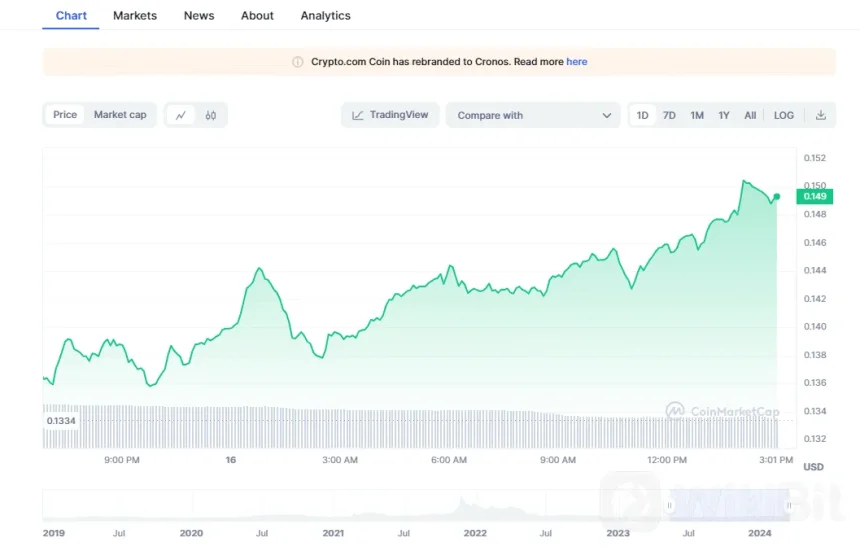 Meanwhile, as of writing, the Cronos price was up 11.90% and exchanged hands at $0.1493, while its trading volume fell 33.86% to $43.79 million. Notably, the CRO price saw a high of $0.1509 and a low of $0.131 in the last 24 hours.