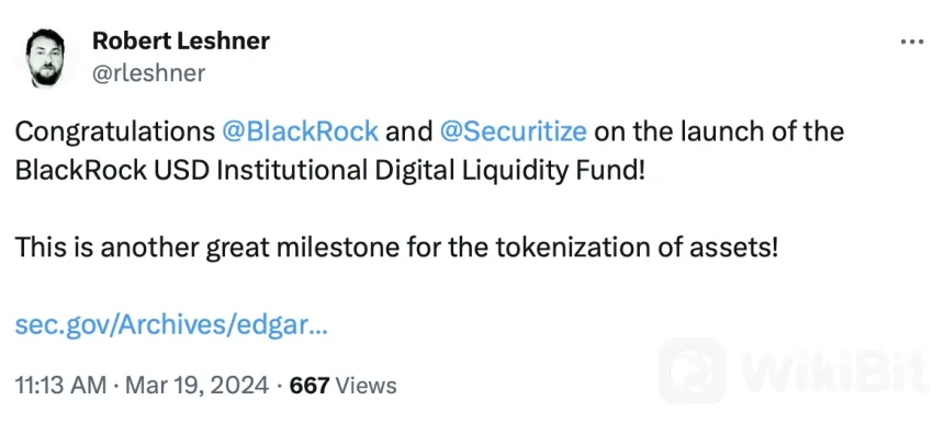 WikiBit 2024-03-20 05:15BlackRock, the worlds largest asset manager, has created its first tokenized fund, the BlackRock USD Institutional Digital Liquidity Fund.