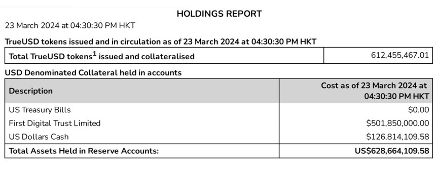 Previously ranked among the top five dollar-pegged cryptocurrencies by market capitalization, TUSD now finds itself in the eighth spot. Its supply has been consistently diminishing, with three-month statistics indicating a starting point of around 2.4 billion. As recently as March 19, the supply had fallen to 1.1 billion, leading to the current count of 612,455,467 TUSD as of March 23, 2024.