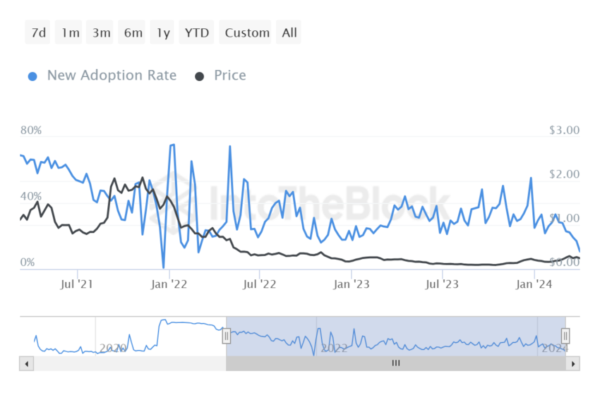 This trend is highlighted by the new adoption rate metric, which assesses transactions made by newly created addresses to gauge whether the project is gaining or losing popularity among investors. For Algorand, this metric has hit a two-month low, indicating a potential decrease in market traction.