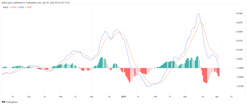 Currently, the MACD shows extended red bars on its histogram, signaling a continued bearish trend. This suggests that Algorands price may continue to face downward pressure.
