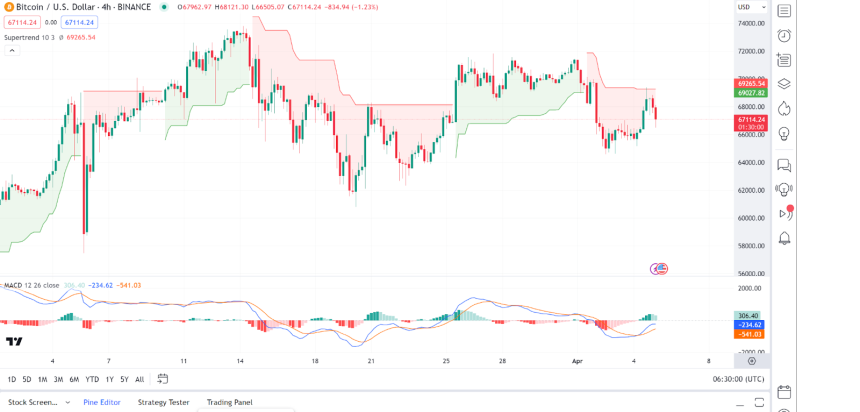 The Moving Average Convergence Divergence (MACD) is below the signal line and negative, which typically indicates bearish momentum. The SuperTrend indicator is above the price, confirming the potential downtrend. As of press time, the Bitcoin price stood at $67,029, representing a 2% pump from its previous 24-hour price.