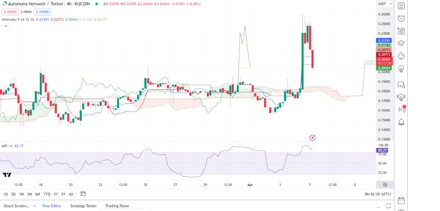 Automata Network (ATA) is another notable gainer in todays session having posted notable gains. Looking at an in-depth analysis, we notice that the chart shows a significant spike in price with a subsequent correction. The price has recently dropped sharply, breaking below the Ichimoku Cloud.