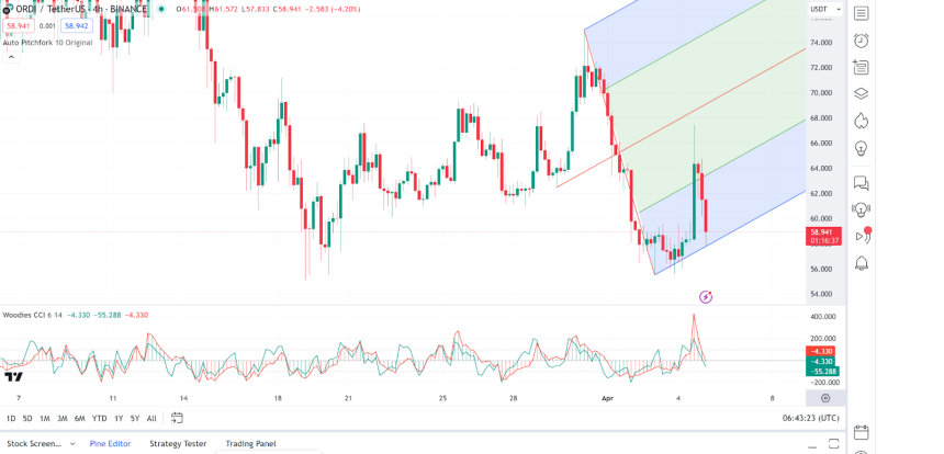 On the other hand, the Commodity Channel Index (CCI) is in the oversold region, which might signal a potential rebound or at least a pause in the downtrend. As of press time, the Ordi price stood at $58.99, representing a 1.3% increase from its previous 24-hour price.