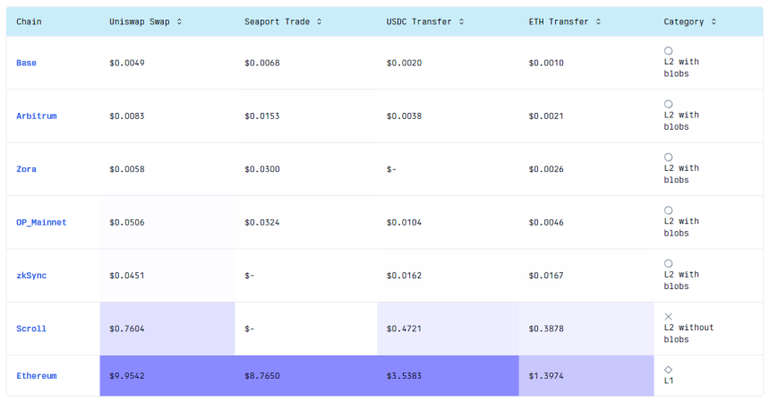 The above data from GasFees.io reveals that transfering ETH on Base averages $0.0011, with token swaps costing $0.0049. On Arbitrum, fees stand at $0.0085 and $0.0021 respectively, while Zora‘s fees are $0.0058 and $0.0026 and OP Mainnet’s fees are $0.0046 and $0.0508.