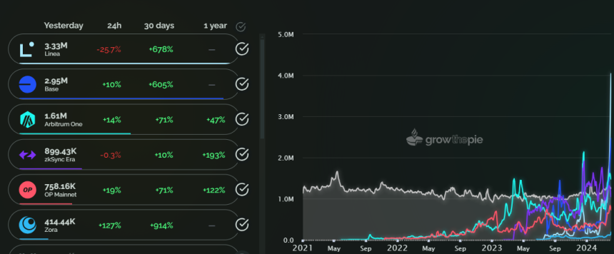 This paired with the viral Memecoin trading season fueled the activity of these ETH L2s to highs. The transaction count of multiple solutions marked respective all-time highs (ATH). Remarkably, Consensys‘s ETH L2 zkEVM rollup Linea spiked by 678% and Coinbase’s Base by 605% over the past month, as per growthepie.xyz data. To highlight, asset manager VanEck predicts Ethereum L2s will attain a trillion-dollar valuation by the end of 2030.